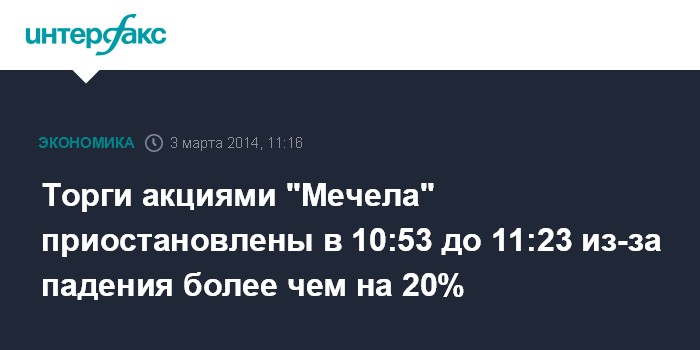 Москва. 3 марта. INTERFAX.RU - "Московская биржа" в понедельник остановила с 10:53 МСК до 11:23 МСК торги обыкновенными акциями "Мечела" из-за падения текущей цены более чем на 20% в течение десяти минут подряд в ходе торговой сессии от цены закрытия предыдущего торгового дня, сообщила биржа.