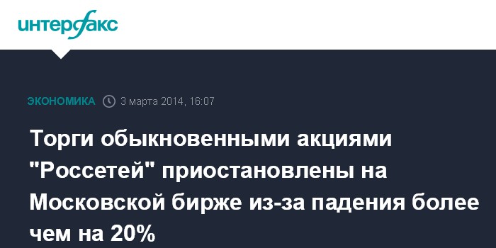 Москва. 3 марта. INTERFAX.RU - "Московская биржа" приостановила в понедельник торги обыкновенными акциями "Российские сети" с 15:58 мск до 16:28 мск из-за падения цен бумаг более чем на 20% в течение десяти минут подряд в ходе торговой сессии от цены закрытия предыдущего торгового дня, сообщила биржа.
