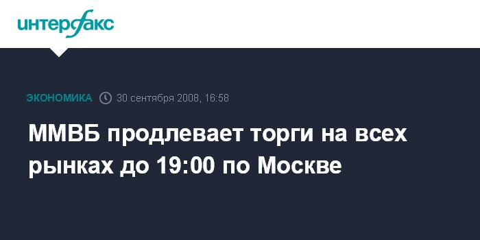 Москва. 30 сентября. INTERFAX.RU - ММВБ приняла решение о продлении с 30 сентября торгов на всех рынках до 19:00 мск, сообщил агентству "Интерфакс-АФИ" официальный представитель биржи.