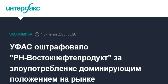 Южно-Сахалинск. 1 октября. ИНТЕРФАКС-ДАЛЬНИЙ ВОСТОК - Сахалинское управление федеральной антимонопольной службы РФ привлекло к административной ответственности ООО "РН-Востокнефтепродукт" за злоупотребление доминирующим положением на товарном рынке (ст. 14.31 КоАП РФ).