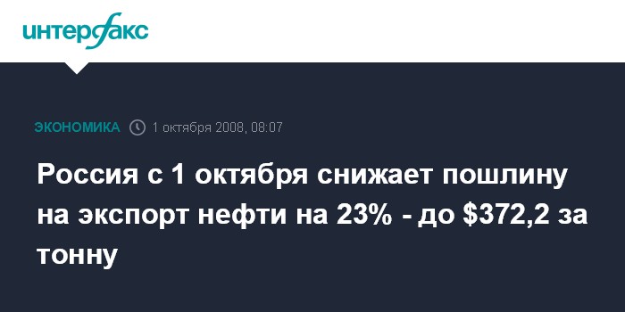 Москва. 1 октября. INTERFAX.RU - Россия снижает с 1 октября пошлину на экспорт нефти с рекордных $485,8 до $372,2 за тонну.
