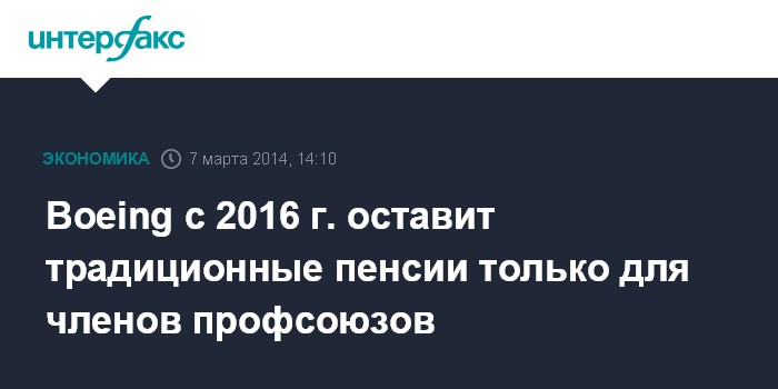 Москва. 7 марта. INTERFAX.RU - Аэрокосмический концерн Boeing Co. с 2016 года приостановит традиционные пенсионные отчисления для работников и руководителей, не являющихся членами профсоюзов, число которых в компании превышает 68 тыс. человек, сообщает агентство Bloomberg.