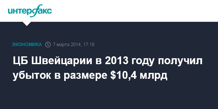 Москва. 7 марта. INTERFAX.RU - Центробанк Швейцарии по итогам 2013 года получил чистый убыток в размере 9,1 млрд швейцарских франков ($10,4 млрд) против прибыли в 6 млрд франков годом ранее из-за существенных потерь, связанных с падением стоимости золота.