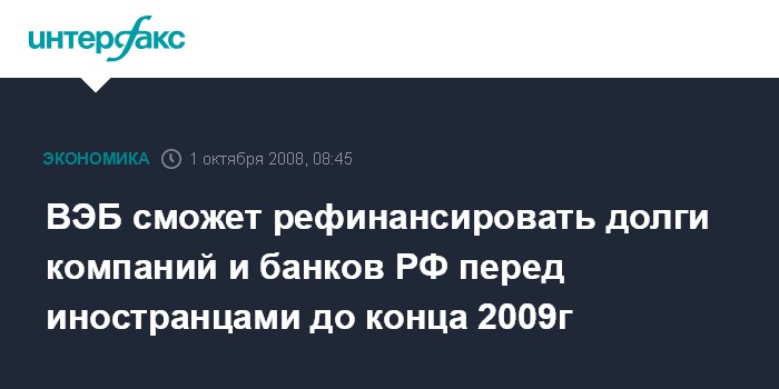 "В связи с ухудшением ситуации на глобальном финансовом рынке, невозможностью рефинансироваться за рубежом и обострением спроса на ликвидность ВЭБ получит право предоставлять российским банкам и нефинансовым компаниям кредиты для погашения задолженности перед иностранными кредитными организациями, которая возникла до 25 сентября 2008 года", - сообщил первый заместитель председателя Банка России Алексей Улюкаев в интервью агентству "Интерфакс-АФИ".