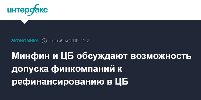 Москва. 1 октября. INTERFAX.RU - Минфин и ЦБ РФ обсуждают возможность допуска финансовых компаний к рефинансированию в ЦБ наравне с банками, сообщил журналистам помощник президента РФ Аркадий Дворкович.