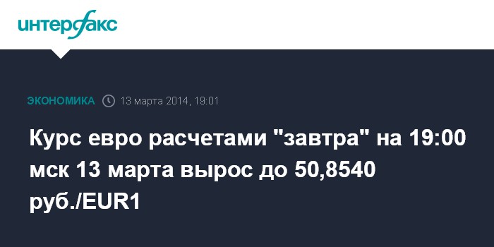 Москва. 13 марта. INTERFAX.RU - Средневзвешенный курс евро расчетами "завтра" на единой торговой сессии (ЕТС) Московской биржи в четверг по данным на 19:00 МСК вырос на 20,62 копейки по сравнению с результатом предыдущих торгов и составил 50,8540 руб./EUR1.