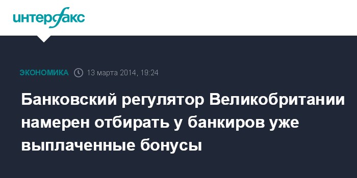 Москва. 13 марта. INTERFAX.RU - Национальный банковский регулятор Великобритании Prudential Regulatory Authority (PRA), являющийся подразделением Банка Англии, предложил законопроект, который позволит сокращать размер премиальных, уже выплаченных банкирам, сообщается в пресс-релизе PRA.