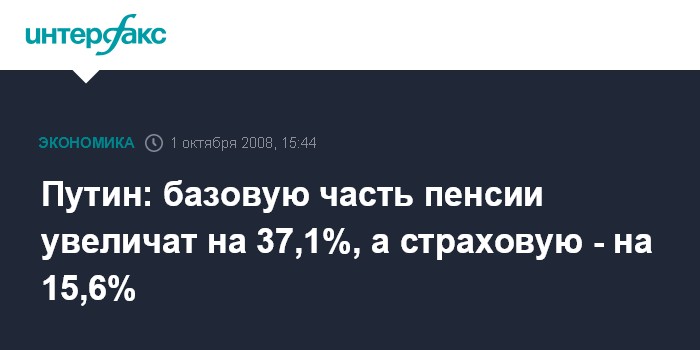 Москва. 1 октября. INTERFAX.RU - Базовая часть трудовой пенсии будет увеличена в 2009 году на 37,1% а страховая - на 15, 6%, заявил премьер-министр РФ Владимир Путин.