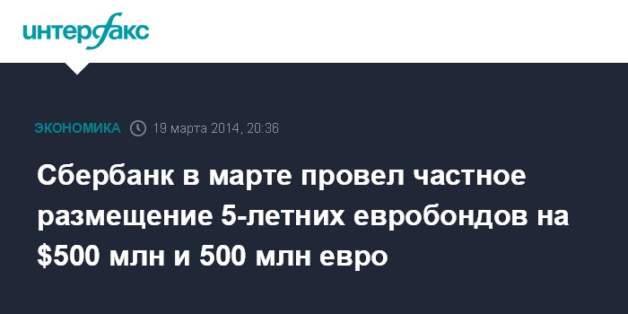 Сбербанк в марте провел частное размещение 5-летних евробондов на $500 млн и 500 млн евро