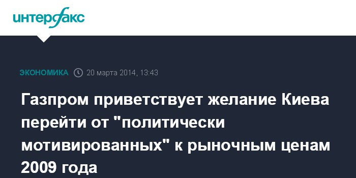 Москва. 20 марта. INTERFAX.RU - "Газпром" приветствует стремление руководства Украины перейти на рыночные цены закупки российского газа и уйти от политической составляющей в ценообразовании.