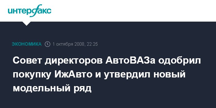 Москва. 1 октября. ИНТЕРФАКС - Совет директоров ОАО "АвтоВАЗ" (РТС: AVAZ) одобрил в среду покупку ОАО "ИжАвто" и утвердил новый модельный ряд производимых компанией автомобилей до 2014 года, сообщил "Интерфаксу" источник в ОАО.