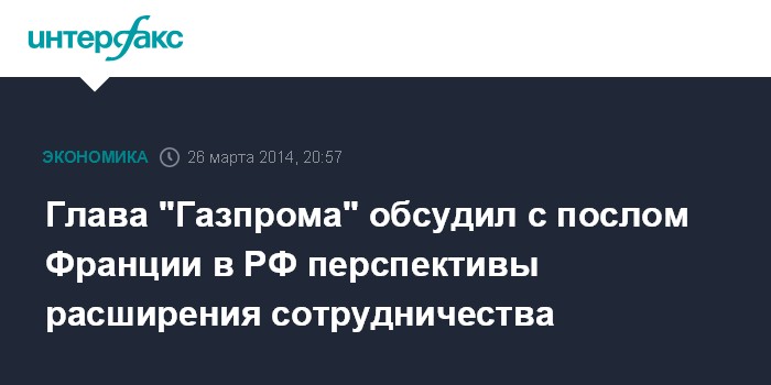 Москва. 26 марта. INTERFAX.RU - Глава "Газпрома" Алексей Миллер и посол Франции в России Жан-Морис Рипер на фоне растущей напряженности между Россией и Евросоюзом и угроз со стороны последнего снизить зависимость от поставок российских энергоресурсов провели рабочую встречу.