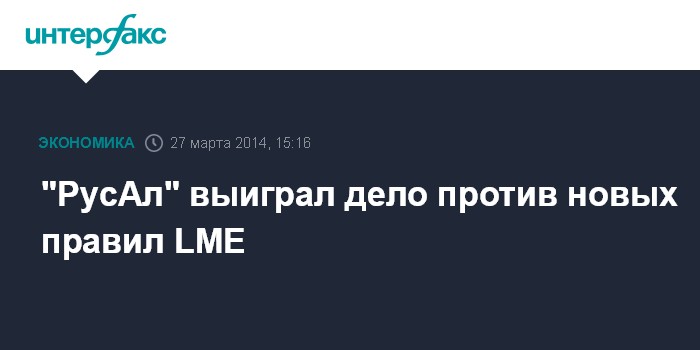 Москва. 27 марта. INTERFAX.RU - ОК "РусАл" выиграла судебный спор против Лондонской биржи металлов (LME) в отношении принятия новых правил складирования, сообщила компания.