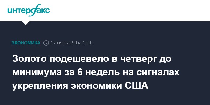Москва. 27 марта. INTERFAX.RU - Стоимость золота упала в четверг до минимума за шесть недель на сигналах улучшения ситуации в экономике США, повышающих вероятность дальнейшего сокращения объемов стимулирования Федеральной резервной системой (ФРС) и скорого повышения базовой процентной ставки, сообщает агентство Bloomberg.