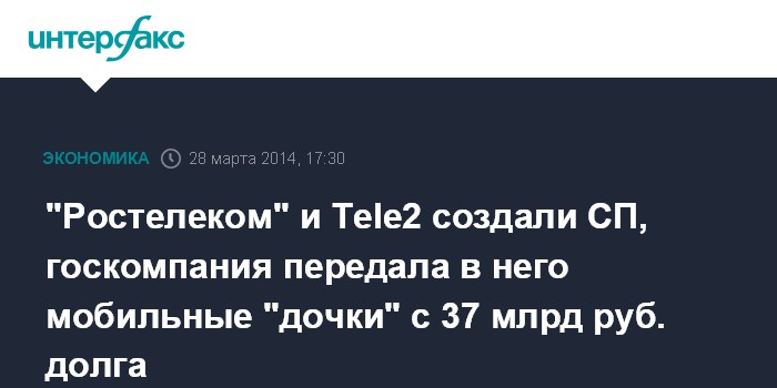 Одновременно в СП переданы долговые обязательства на общую сумму около 37 млрд рублей. Как сообщалось, в течение II квартала мобильные "дочки", вошедшие в состав СП, должны погасить свою внутригрупповую задолженность перед "Ростелекомом". Ее размер не раскрывался.