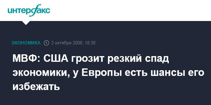 Москва. 2 октября. INTERFAX.RU - Вероятность резкого спада экономики США остается значительной, в то время как Европа более защищена от рецессии, считает Международный валютный фонд (МВФ).