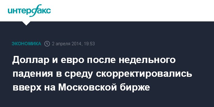 Москва. 2 апреля. INTERFAX.RU - Доллар США и евро после заметного падения в течение более чем недельного периода в среду скорректировались вверх на Московской бирже, стоимость бивалютной корзины умеренно подросла и вернулась в зону интервенций ЦБ РФ после сообщения о том, что Минфин в ближайшие дни возобновит покупки валюты.