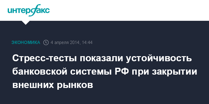 Москва. 4 апреля. INTERFAX.RU - Стресс-тесты показали устойчивость российской банковской системы при закрытии внешних рынков, заявил первый зампред ЦБ РФ Алексей Симановский журналистам в пятницу.