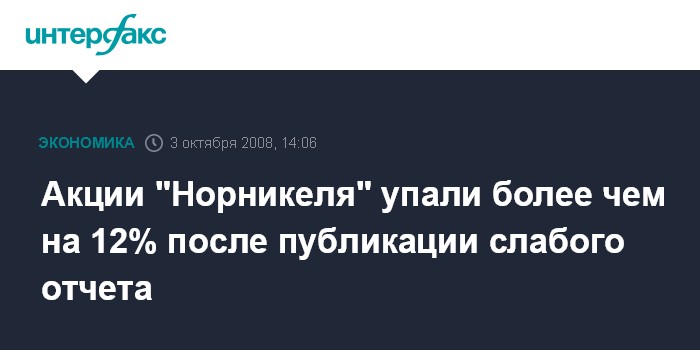 Москва. 3 октября. INTERFAX.RU - Акции ГМК "Норильский никель" рухнули в пятницу более чем на 12% после публикации отчета компании за I полугодие по МСФО, не оправдавшего ожиданий аналитиков.