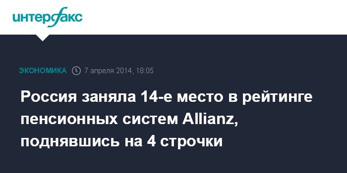 Москва. 7 апреля. INTERFAX.RU - Россия занимает 14-е место из 50 стран в обновленном Индексе устойчивости пенсионных систем (PSI) компании Allianz, поднявшись на 4 позиции в рэнкинге по сравнению с 2011 годом, когда была опубликована предыдущая версия PSI.