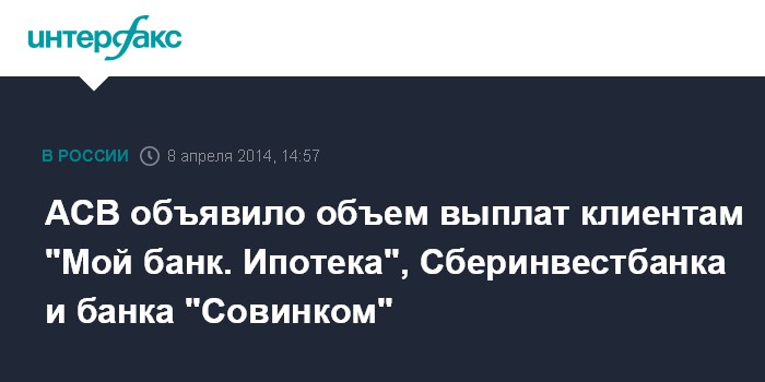 Москва. 8 апреля. INTERFAX.RU - Агентство по страхованию вкладов (АСВ) выплатит вкладчикам "Мой банк. Ипотека", Сберинвестбанка и банка "Совинком" в совокупности более 1,86 млрд рублей, следует из сообщений госкорпорации.
