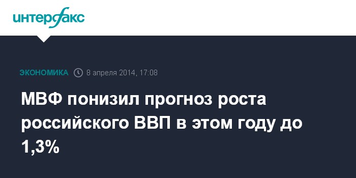 Москва. 8 апреля. INTERFAX.RU - Международный валютный фонд (МВФ) понизил прогноз роста экономики России в 2014 году до 1,3% с 2%, прогнозировавшихся им в январе, и до 2,3% в 2015 году с 2,5%, говорится в обзоре мировой экономики (World Economic Outlook Update, WEO).