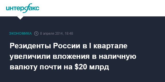Москва. 8 апреля. INTERFAX.RU - Резиденты РФ, относящиеся к небанковскому сектору, в первом квартале 2014 года увеличили вложения в наличную иностранную валюту на $19,6 млрд, что в 10 раз больше, чем в первом квартале 2013 года (рост на $1,9 млрд). Такой вывод позволяет сделать опубликованная на сайте Банка России оценка платежного баланса РФ за первый квартал 2014 года.