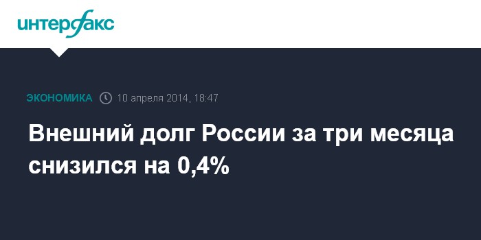 Москва. 10 апреля. INTERFAX.RU - Внешний долг РФ в первом квартале 2014 года снизился на $3,208 млрд, или на 0,4% - до $723,854 млрд с $727,062 млрд, сообщается в информации, размещенной на сайте ЦБ РФ.
