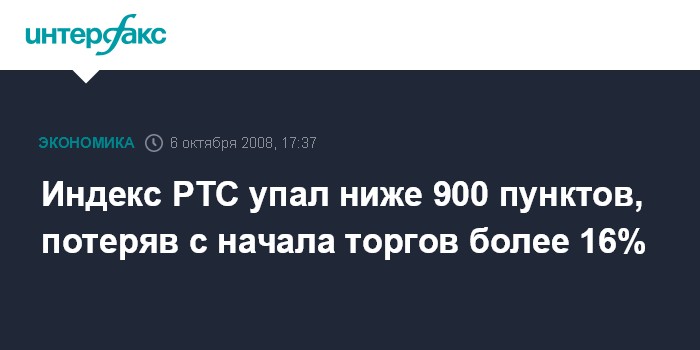 Москва. 6 октября. INTERFAX.RU - Индекс РТС в понедельник упал ниже 900 пунктов, потеряв с начала торгов более 16%. К 17:33 мск значение индикатора биржи составило 899,25 пункта (-16,03%), торги на бирже в понедельник приостанавливались дважды - с 14:05 до 15:05 мск и с 15:30 до 17:30 по московскому времени.