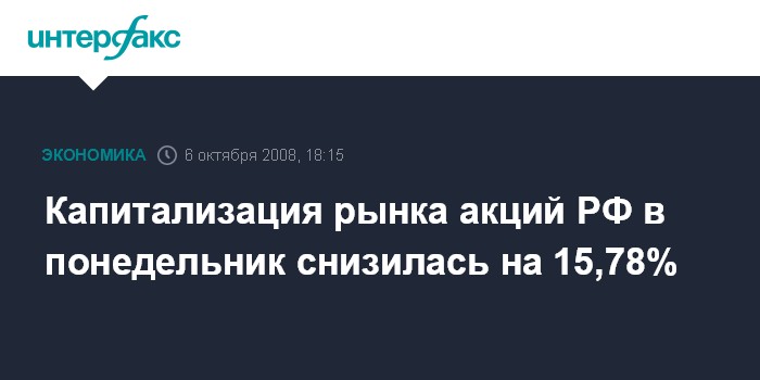 Капитализация рынка акций РФ в понедельник снизилась на 15,78%