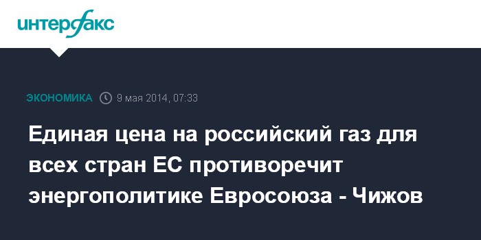 Москва. 9 мая. INTERFAX.RU - Идея единой цены на российский газ для всего Евросоюза "не вызывает восторга у правительств и энергокомпаний стран ЕС", заявил российским журналистам постпред России при ЕС Владимир Чижов.