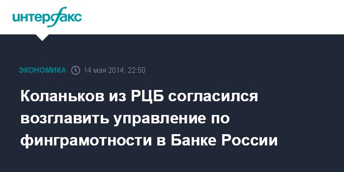 Москва. 14 мая. INTERFAX.RU - Президент издательского дома "Рынок ценных бумаг" Александр Коланьков займет пост руководителя Управления по финансовой грамотности, создаваемого в Банке России.