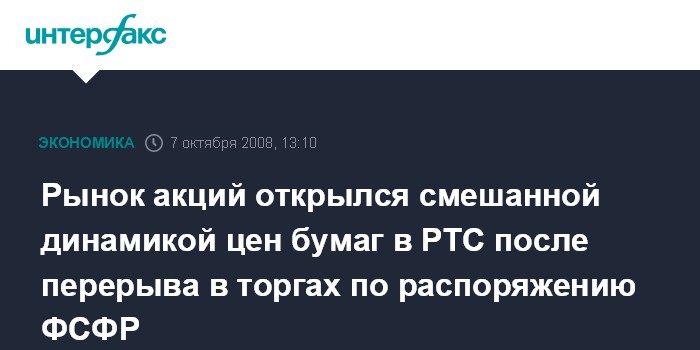 Москва. 7 октября. INTERFAX.RU – Российский рынок акций открылся во вторник при смешанной динамике цен бумаг в РТС после перерыва в торгах с 10:00 до 13:00 МСК по предписанию ФСФР России, индекс РТС в первые минуты сессии опустился на полпроцента.