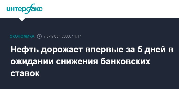 Москва. 7 октября. INTERFAX.RU - Нефть подорожала на 3,7%, впервые за 5 дней, в ожидании снижения банковских ставок.