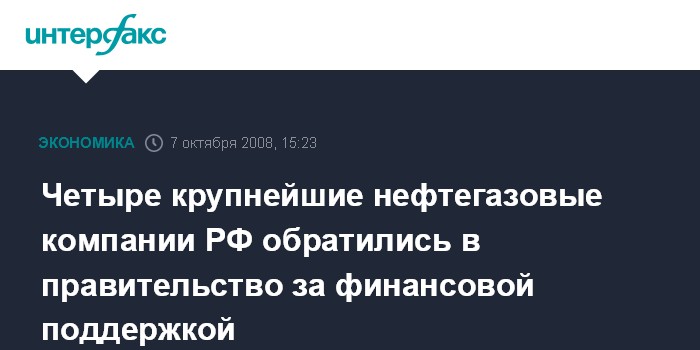 Москва. 7 октября. INTERFAX.RU - Четыре крупнейшие нефтегазовые компании РФ - "ЛУКОЙЛ", "Роснефть", ТНК-ВР и "Газпром" - обратились в правительство с просьбой выделить им кредиты на рыночных условиях для погашения задолженности по внешним заимствованиям.