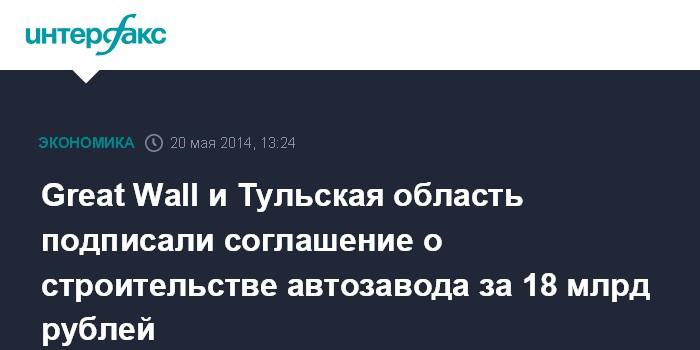 Great Wall и Тульская область подписали соглашение о строительстве автозавода за 18 млрд рублей