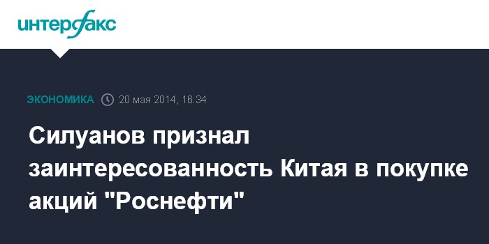 Москва. 20 мая. INTERFAX.RU - Китай выразил заинтересованность в покупке акций НК "Роснефть", сообщил журналистам министр финансов Антон Силуанов.