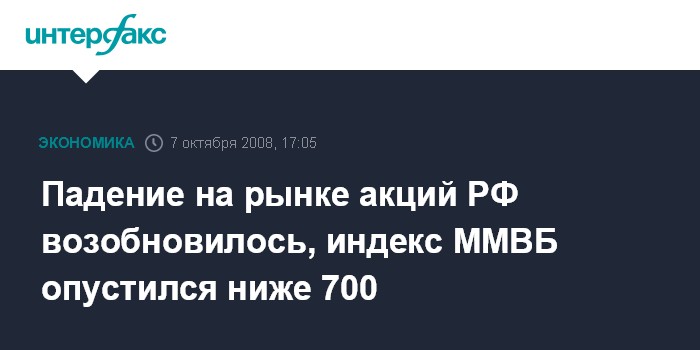 Москва. 7 октября. INTERFAX.RU - После локального отскока падение на рынке акций РФ во вторник возобновилось, индекс ММВБ к 16:54 мск опустился ниже 700 пунктов, потеряв за день более 7%.