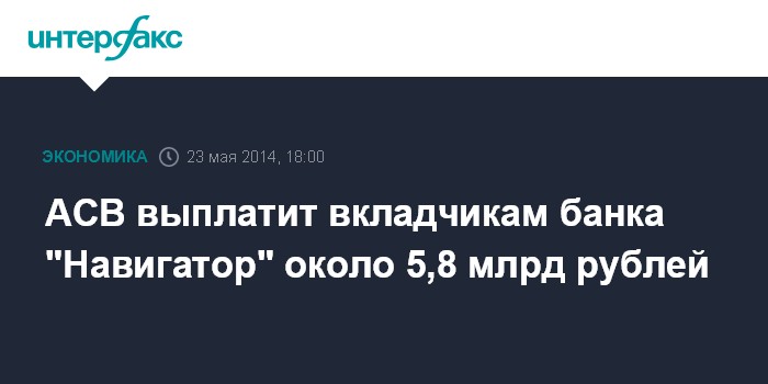 Москва. 23 мая. INTERFAX.RU - Агентство по страхованию вкладов (АСВ) 26 мая начнет выплаты страхового возмещения вкладчикам банка "Навигатор". За выплатой страхового возмещения на общую сумму 5,8 млрд рублей могут обратиться порядка 13,5 тыс. вкладчиков, говорится в сообщении госкорпорации.
