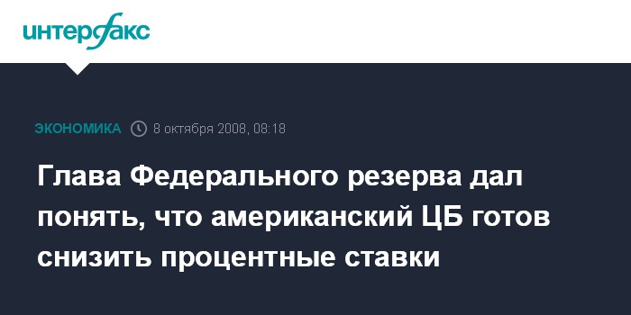 Москва. 8 октября. INTERFAX.RU - Глава Федерального резерва Бен Бернанке дал понять во вторник, что американский ЦБ готов снизить процентные ставки, чтобы поддержать экономику США в условиях снижения доступности кредитов, сообщает агентство Bloomberg.