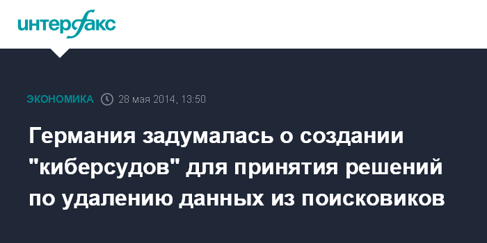 Москва. 28 мая. INTERFAX.RU - Германия может создать специальные "киберсуды" для вынесения решений по требованиям граждан к поисковым сервисам удалить упоминания их личных данных, пишет Financial Times со ссылкой на представителя министерства внутренних дел страны.