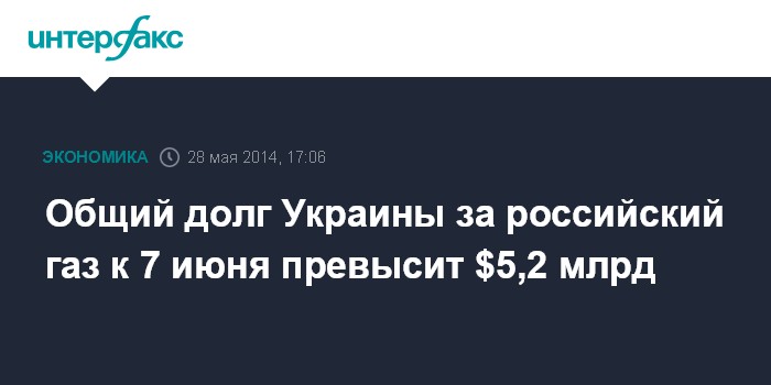Москва. 28 мая. INTERFAX.RU - Общий долг Украины за российский газ к 7 июня превысит $5,2 млрд, заявил председатель правления ОАО "Газпром" Алексей Миллер в ходе совещания президента РФ Владимира Путина с членами правительства в среду в Москве.