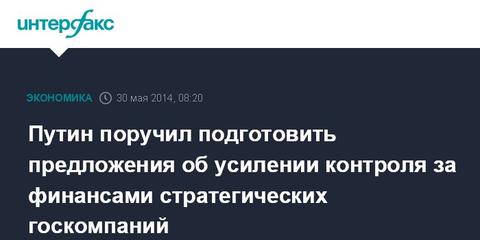 Москва. 30 мая. INTERFAX.RU - Президент Владимир Путин поручил Министерству финансов и Центральному банку подготовить предложения об усилении контроля за финансами стратегических компаний, сообщает газета "Ведомости" в пятницу.