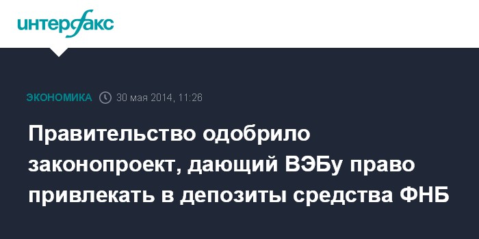 Москва. 30 мая. INTERFAX.RU - Правительство России одобрило поправки в Бюджетный кодекс, предусматривающие возможность размещения на депозитах Внешэкономбанка до 7% средств Фонда национального благосостояния (ФНБ), говорится на сайте кабмина.