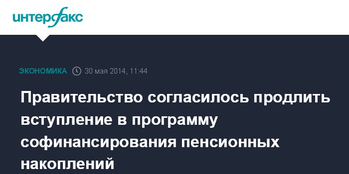 Москва. 30 мая. INTERFAX.RU - Правительство России одобрило законопроект, продлевающий возможность вступления россиян в госпрограмму софинансирования добровольных пенсионных накоплений до конца текущего года, говорится на сайте кабмина.