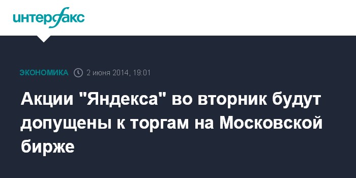 Москва. 2 июня. INTERFAX.RU - Акции класса "А" нидерландской Yandex N.V. (головная компания интернет-холдинга "Яндекс) во вторник будут допущены к торгам на "Московской бирже", сообщил "Интерфаксу" источник на рынке.