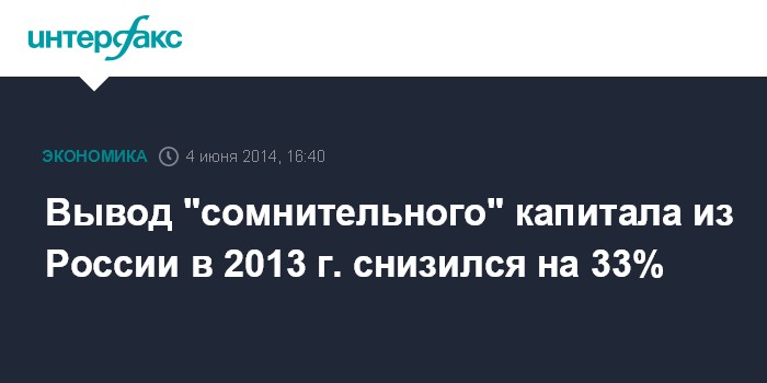 Москва. 4 июня. INTERFAX.RU - Вывод капитала из РФ по сомнительным основаниям в 2013 году снизился на 33% - до $26 млрд, заявил зампред ЦБ РФ Дмитрий Скобелкин в ходе заседания рабочей группы Госдумы в среду. В 2012 г. эта сумма составила порядка $39 миллиардов.
