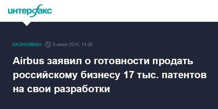 Москва. 5 июня. INTERFAX.RU - Airbus Group готова продать российскому бизнесу 17 тыс. патентов на свои разработки, сообщил член совета директоров компании Жан Ботти в четверг в Новосибирске в ходе международного форума "Технопром-2014". "Мы поняли, что эти технологии могут использоваться и в других отраслях (не только в авиастроении - ИФ)", - сказал он.