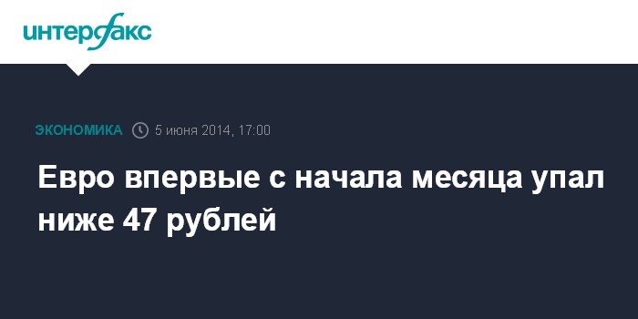Москва. 5 июня. INTERFAX.RU - Евро в четверг впервые в июне упал ниже уровня 47 рублей торгах "Московской биржи". В то же время рубль усилил рост по отношению к бивалютной корзине на фоне падения евро на рынке Forex после решений Европейского Центробанка (ЕЦБ).
