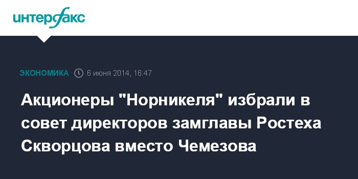 Москва. 6 июня. INTERFAX.RU - Акционеры "Норильского никеля" на годовом собрании в пятницу выбрали в совет замгендиректора ГК "Ростех" Сергея Скворцова, который заменит в составе совета главу ГК Сергея Чемезова.